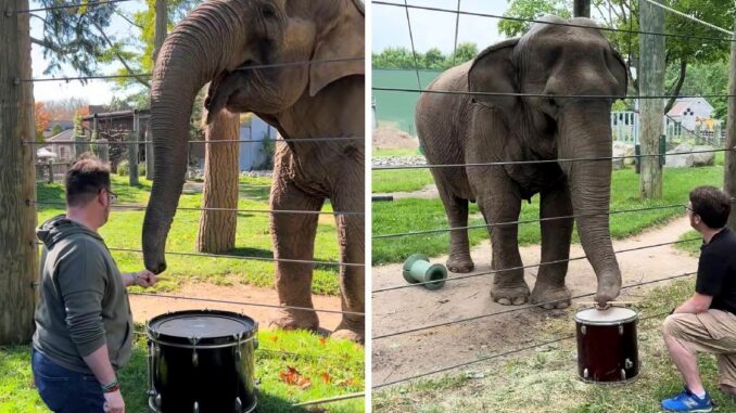The video shows the curious elephant interacting with Jon, who is standing on the other side of the fence with drumsticks in his hands. At one point, the person behind the camera says, “I think she wants your stick.” Jon hands her the stick, and Emily’s first attempt at playing the drums becomes an internet hit.
