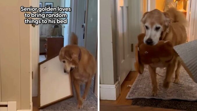 Dog owners often find mysterious objects in their pets’ beds, from stolen socks to treats. But Duke, a nine-year-old golden retriever who was adopted 18 months ago, has taken his collecting habit to a whole new level. His new family has released an adorable video showing the unusual items he brings to his bed, and the story behind it has left many heartbroken.